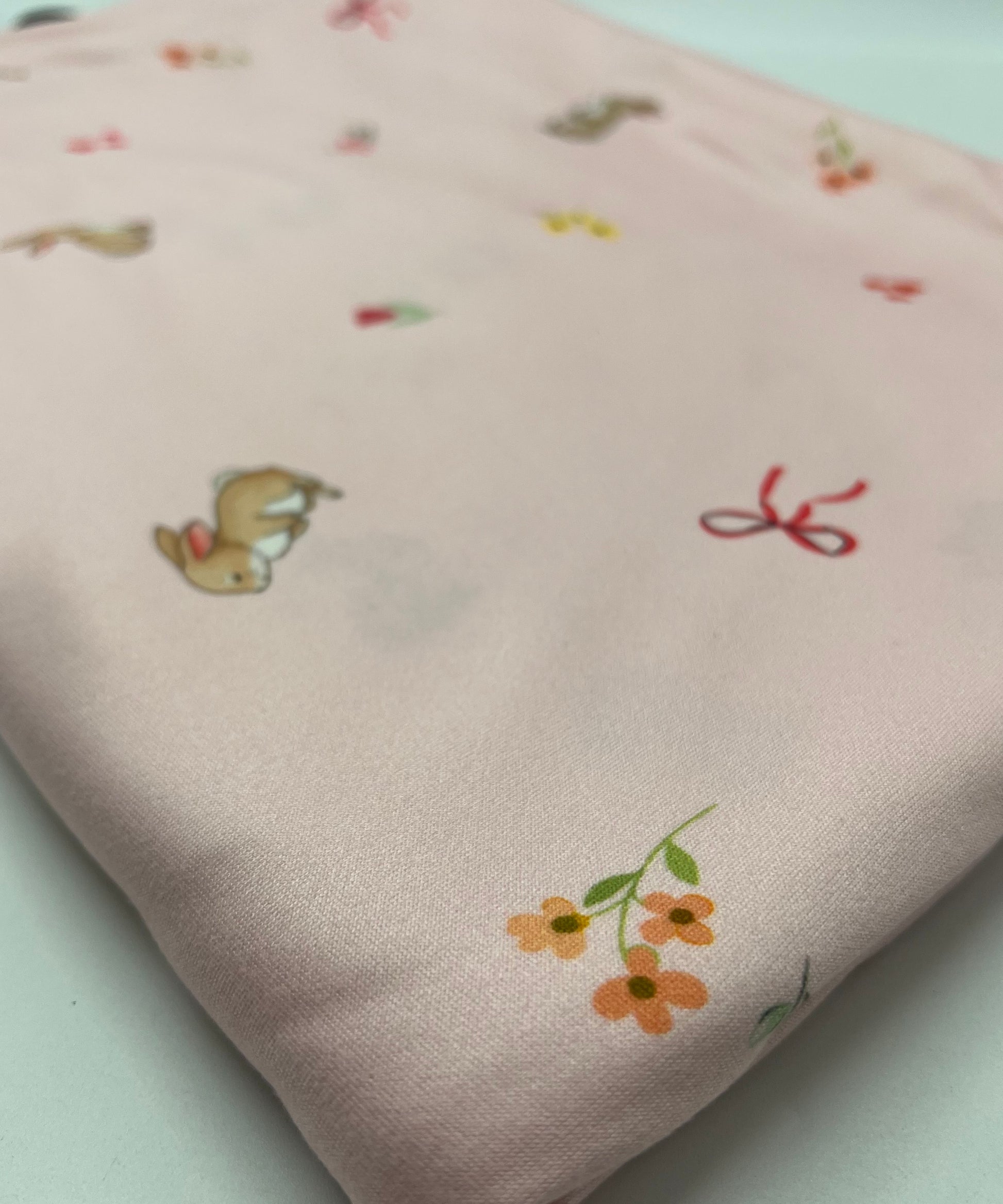 Easter Bunny Heart Super Soft Print Spun Poly Stretch Fabric is a medium weight fabric between basic polyester and cotton. It looks and feels like a cotton jersey and is a lot more durable. This fabric is very soft on the skin and perfect for all sorts of clothing such as maxi dresses, loungewear, trousers and tops etc,