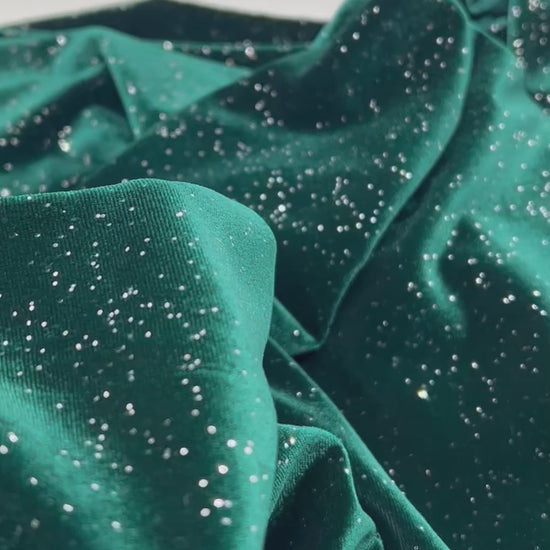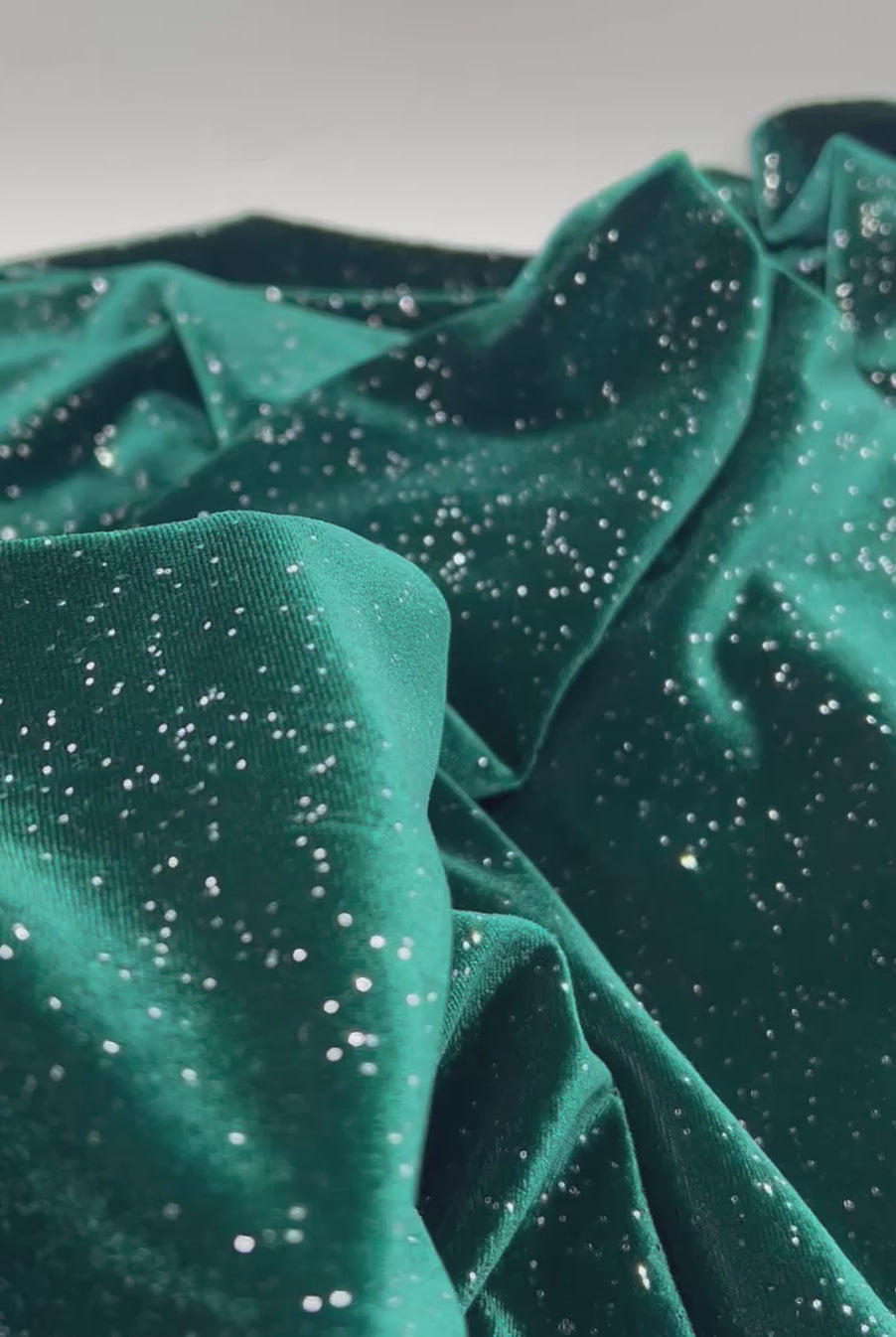 Discover the perfect balance of elegance and comfort with our Plain Bottle Green Sparkle Glitter Velour Stretch Fabric. Expertly crafted from a premium blend of 92% polyester and 8% elastane, this fabric offers a beautifully soft texture with exceptional stretch and recovery.