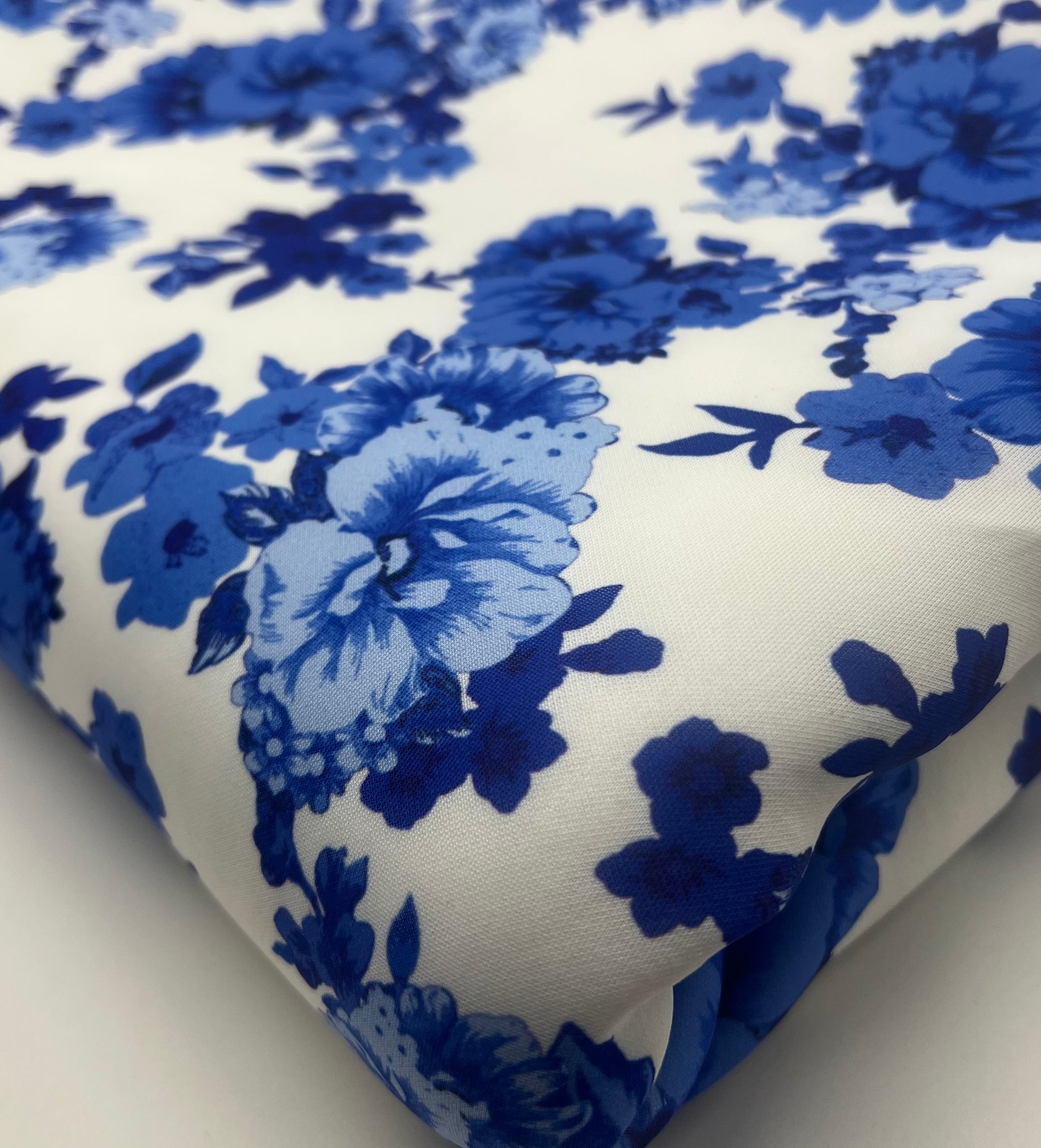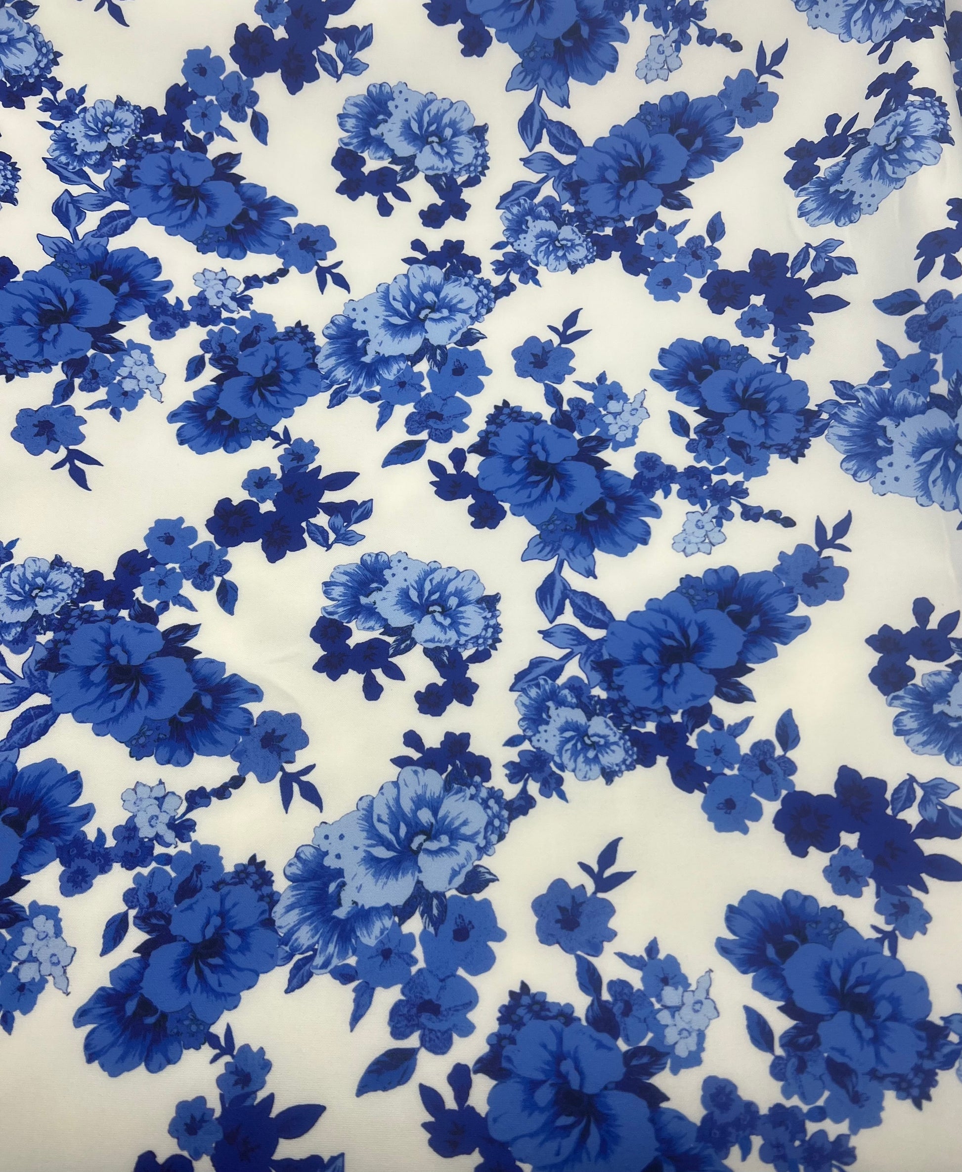 White Blue Floral Scuba Foam 3D Mono Jersey Fabric 2 Way Stretch combines durability and flexibility, making it ideal for structured garments and accessories. Crafted from a polyester and elastane blend, it offers balanced stretch and resilience. With a medium-heavy weight of 270 GSM and a generous 145 cm width, this wrinkle-resistant fabric supports stable, polished designs. Its two-way stretch and easy handling suit both professional and DIY projects, from dresses and costumes to casual wear, providing comfort without compromising structure.